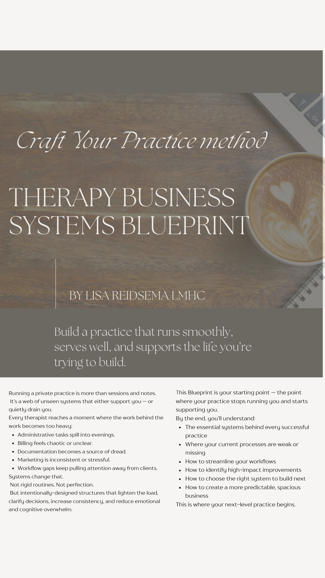 This blueprint helps therapists create a smoother, more organized practice through systems that truly support your day-to-day work. It guides you in evaluating your workflows, understanding what needs to be simplified, and designing processes that reduce chaos and save time. You’ll gain a clearer sense of how to structure your practice so it feels more contained, sustainable, and grounded.